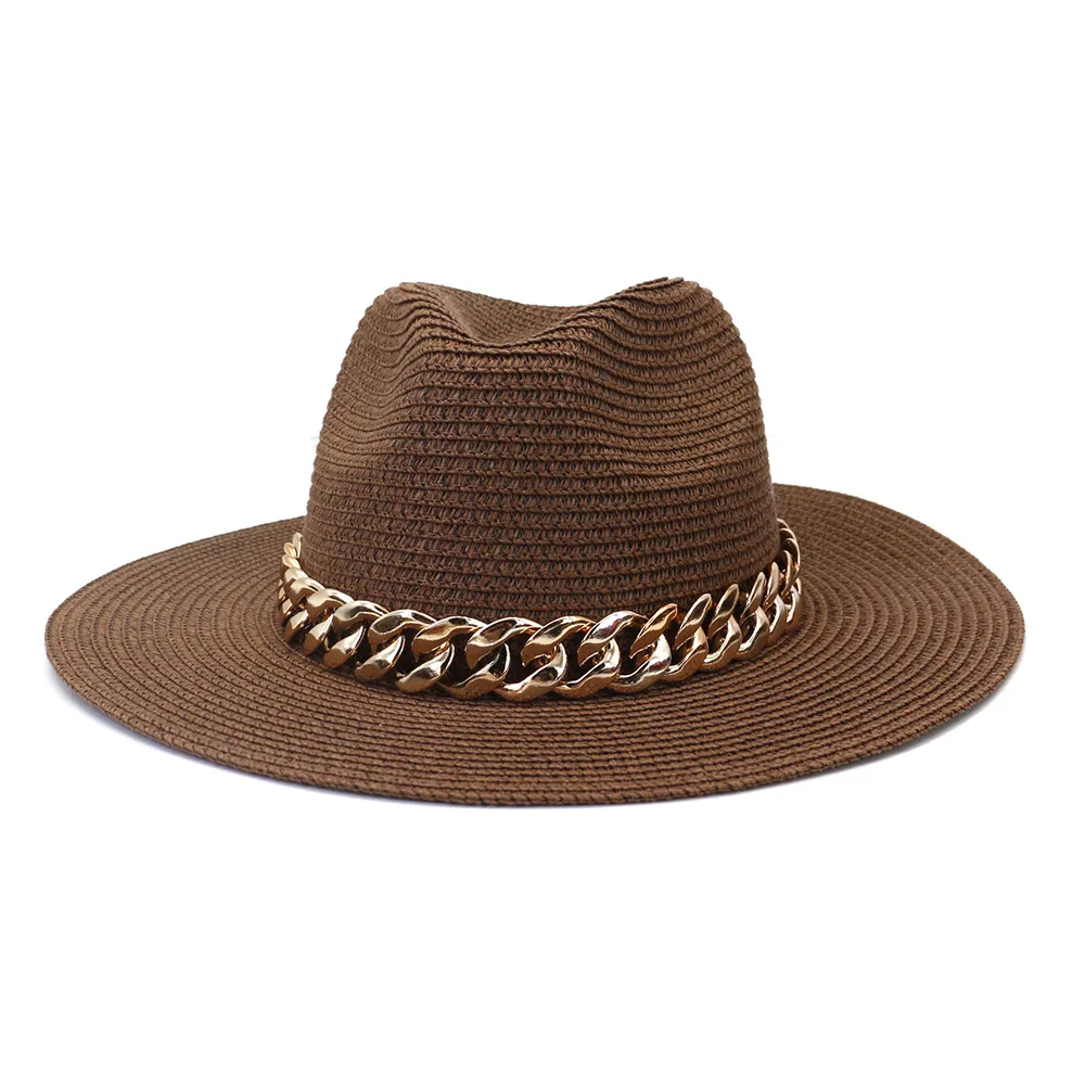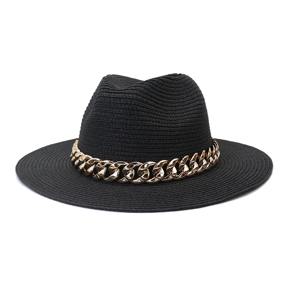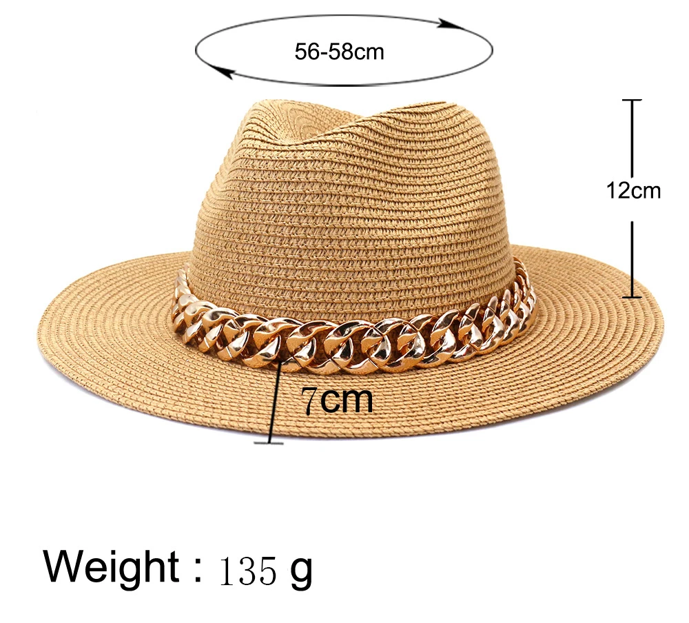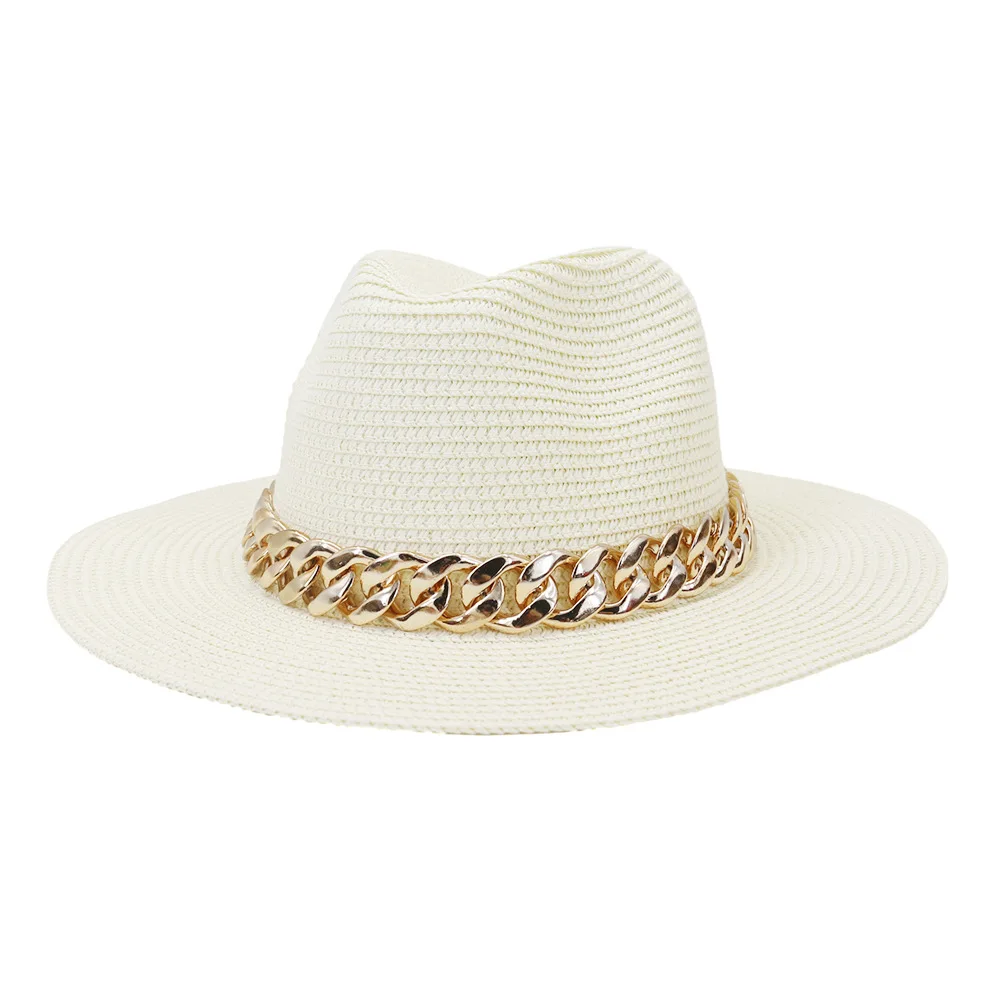 Color: WHITE, Size: M - Fashion Gold Chain Belt Panama Straw Hats For Women Summer Breathable Beach Sun Hats Elegant Ladies Party Jazz Hat