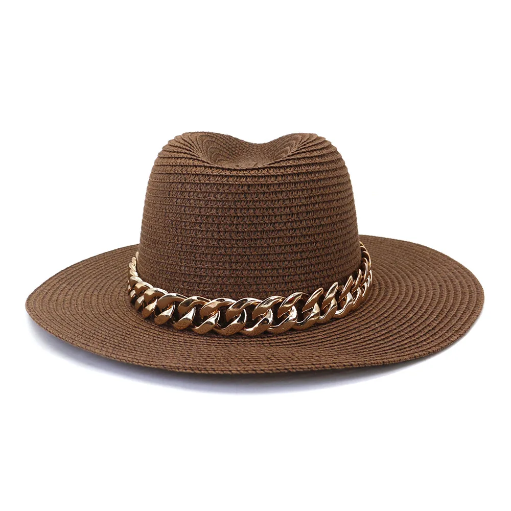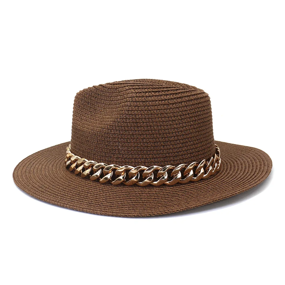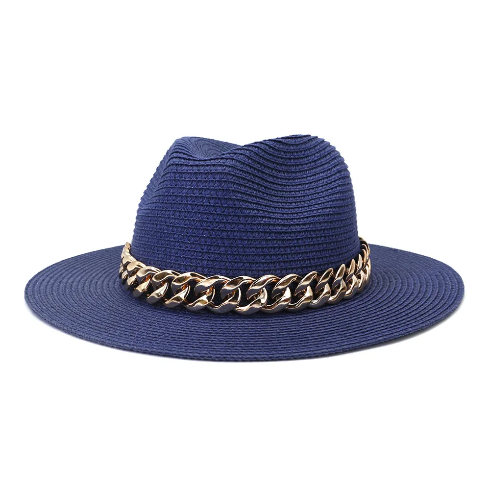 Color: WHITE, Size: M - Fashion Gold Chain Belt Panama Straw Hats For Women Summer Breathable Beach Sun Hats Elegant Ladies Party Jazz Hat