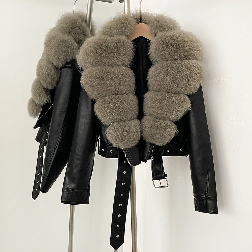 Color: WHITE, Size: XL - Fake Leather Coat New Natural Fox Fur Autumn Short Faux Leather Jacket Female Spring PU Women Long Sleeve Real Fur Coat Thin