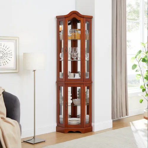 - 【Artistic and Utility】: Corner curio cabinets have a grand and lavish appearance, paired with moderate storage capabilities. It's a perfect way to show off figurines, vintage books,fine china, or your other favorite mementos.Besides putting your treasures on display, it is a fabulous piece to enliven an empty corner.