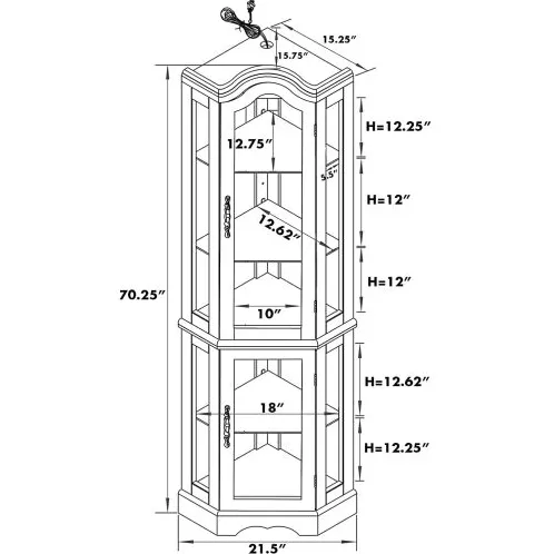 - 【Adjustable Shelves】:This lighted corner curio cabinet offers 2 fixed shelves and 3 tempered glass shelves, which is best for valuable or fragile items.The tempered glass shelves can also be removed if you would like to display taller items. Overall Dimensions: 70.25"H*21.5"W*15.75"D, Holds up to 125 lbs. Each of the shelves can hold up to 25 pounds of distributed weight.