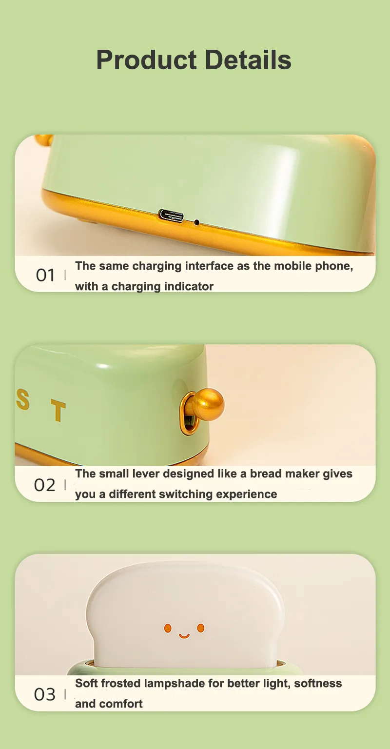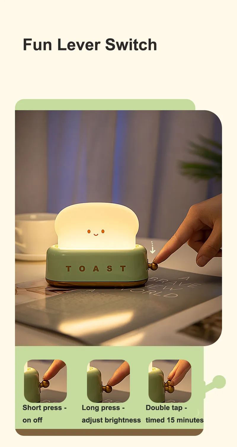 The Creative LED Bread Maker Night Light USB Charging Dimming Toast Lamp is not just a nightlight—it’s a functional, playful, and energy-efficient solution for your lighting needs. Whether you're looking to create a calming atmosphere in your child’s room, add a whimsical touch to your own bedroom, or find a fun gift for someone special, this LED toast lamp is an ideal choice. The dimming feature, USB charging, and built-in timer make it an incredibly practical and versatile addition to any home.