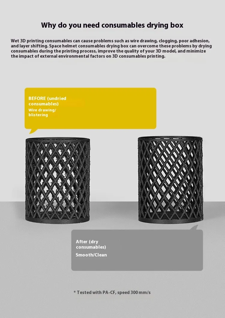 The drying box protects your filaments from absorbing moisture, which can lead to brittleness, bubbles, and uneven extrusion during printing.