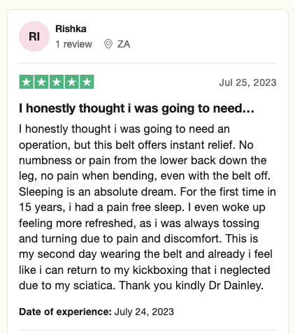 Eliminated their sciatica after 2 weeks of consistent use (wearing the belt for 2 hours/day avg.)