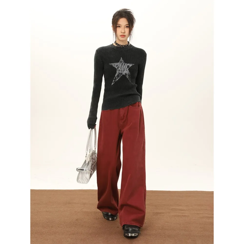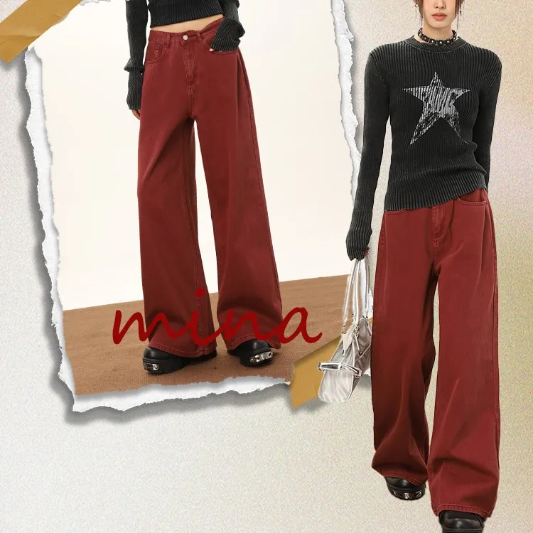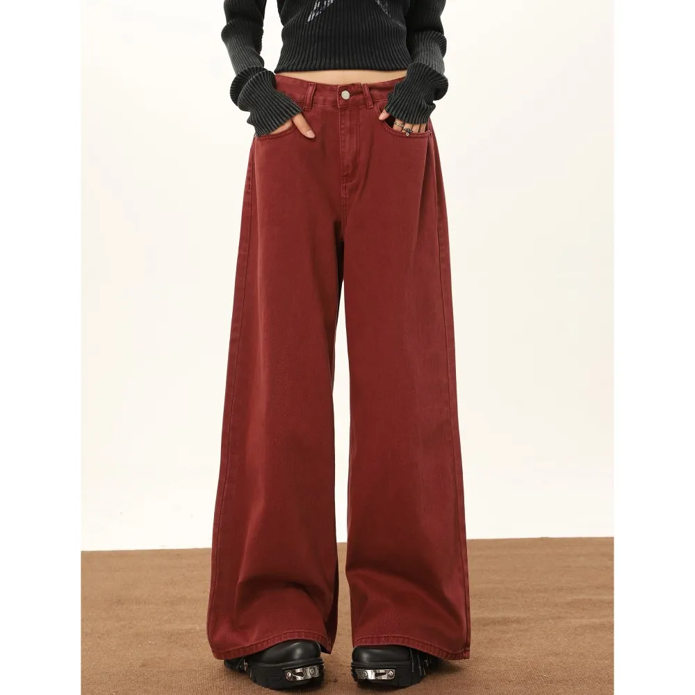 Comfortable Fit: Crafted from high-quality denim with a bit of stretch, the dark red jeans are designed for comfort and