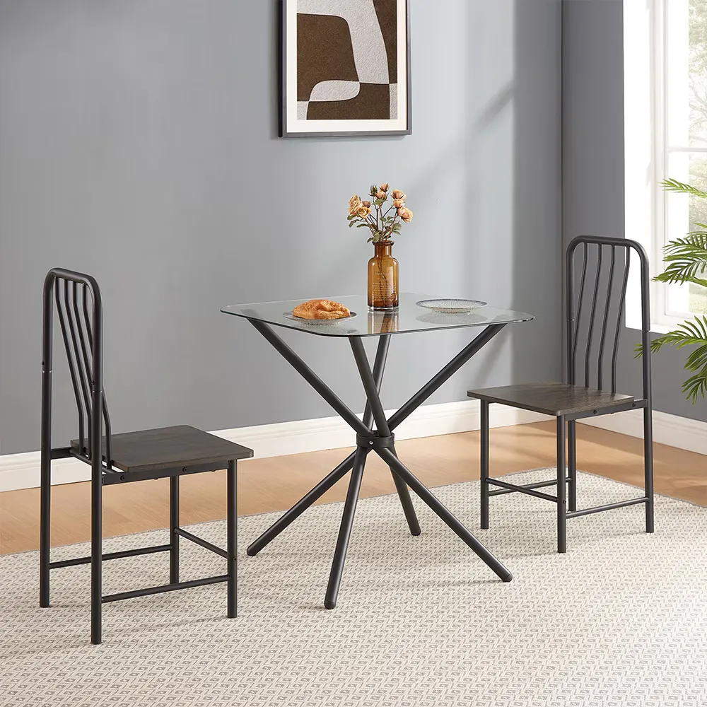 Dining Set for 2 - Square Glass Tempered Dining Table with 4 Legs and 2 Metal Chairs