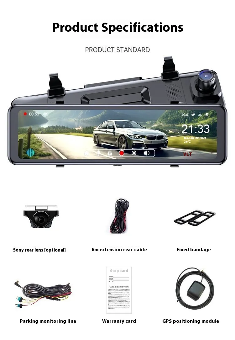 Host * 1 ,Sony rear lens [optional] * 1,6 meter extended rear cable * 1 ,fixed bandage * 1 ,parking monitoring cable * 1 ,GPS positioning