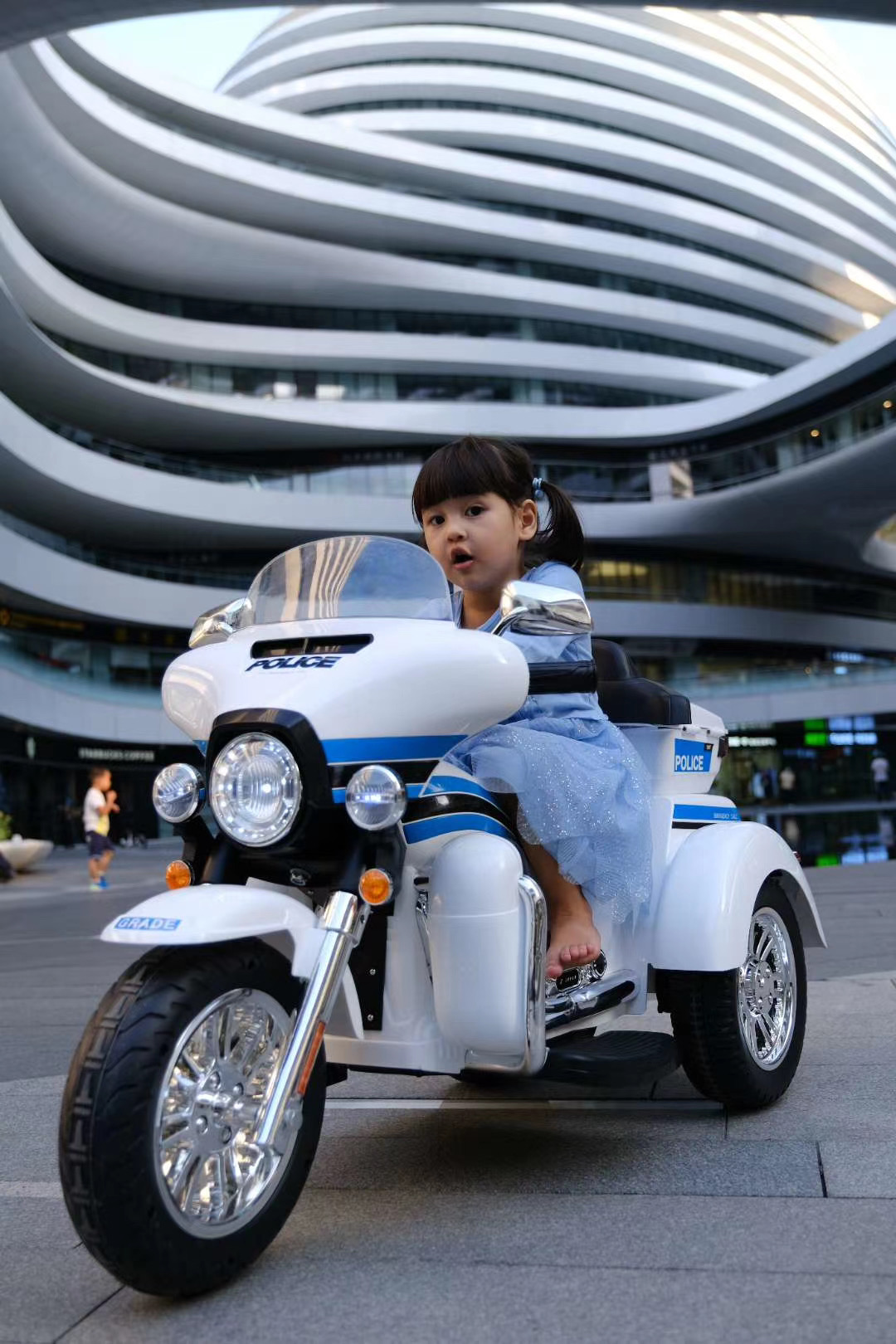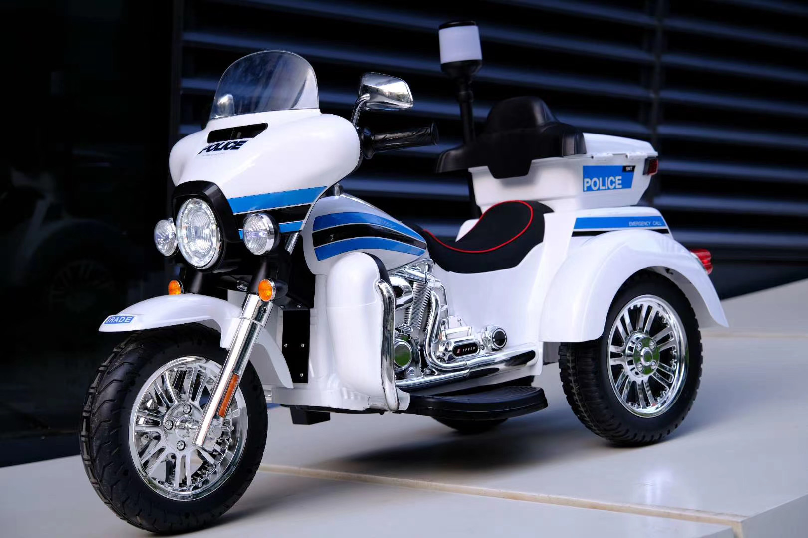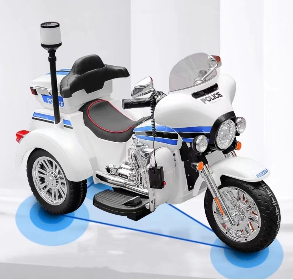 - This ride-on motorbike features a realistic police design complete with authentic markings, a flashing red light, and a sleek white body. Your child will feel like they’re part of the action as they patrol the neighborhood or race to the rescue.