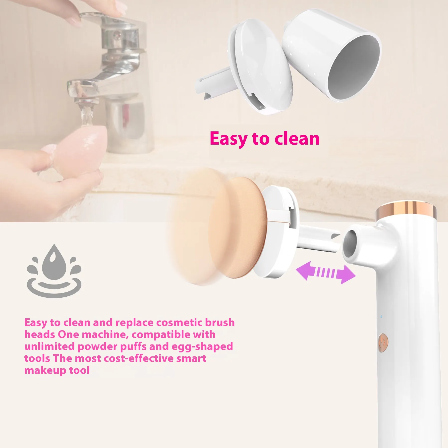 finish with minimal effort. The electric-powered puff machine helps blend makeup seamlessly, offering a smooth, even coverage without the