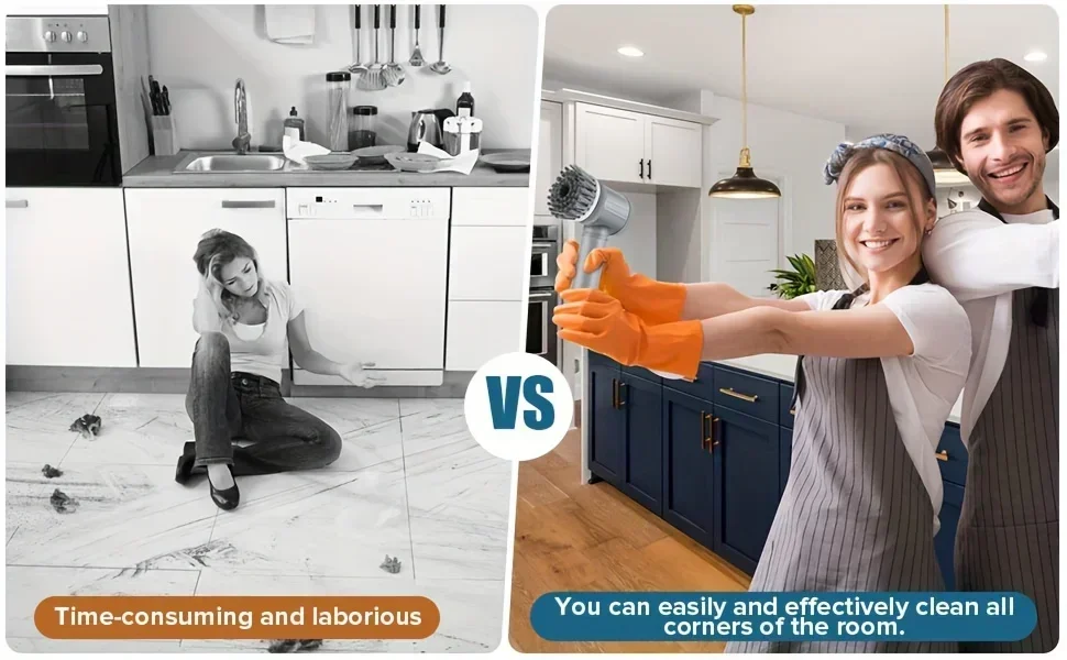 【Portable & Cordless Electric Scrubber】 Getting rid of the long cord, you can easily use this cordless shower brush for cleaning any corner of the house, there will be no more plug and cable trouble. The ergonomic premium silicone grip of this cleaning brush can be held firmly even with sweaty or wet hands, not only saving time and effect, but also protect joints and back . You will find house-cleaning will be so easy with this electric spin scrubber.