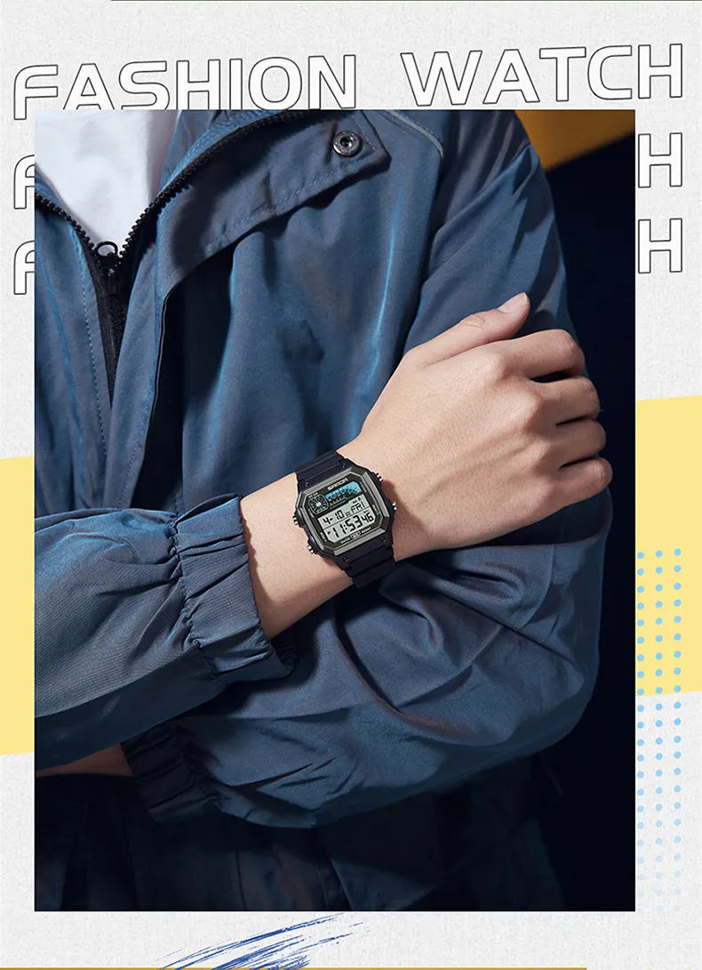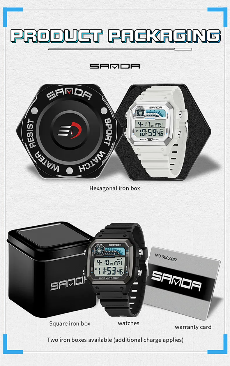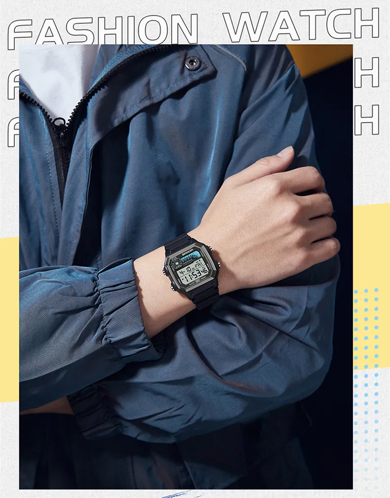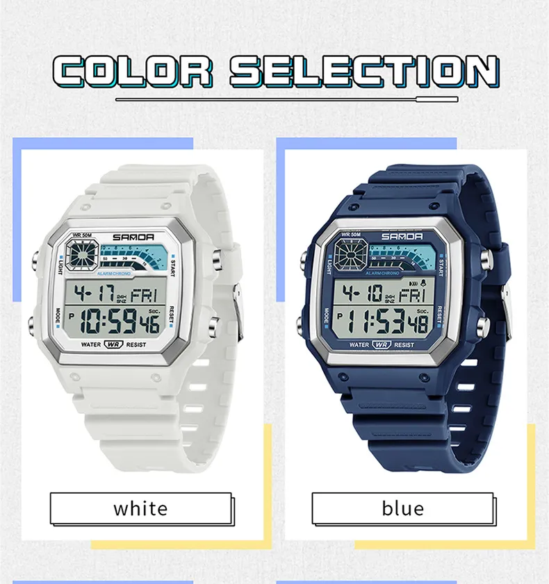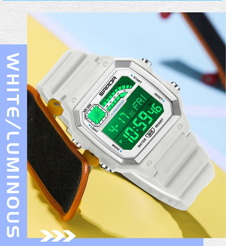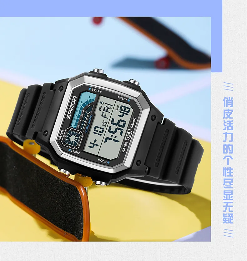 This electronic watch features a thin square design that offers a contemporary and minimalistic look. Equipped with luminous hands or a backlit digital display, it ensures clear visibility in low-light conditions. The waterproof construction makes it suitable for swimming, outdoor sports, and daily activities without worry.