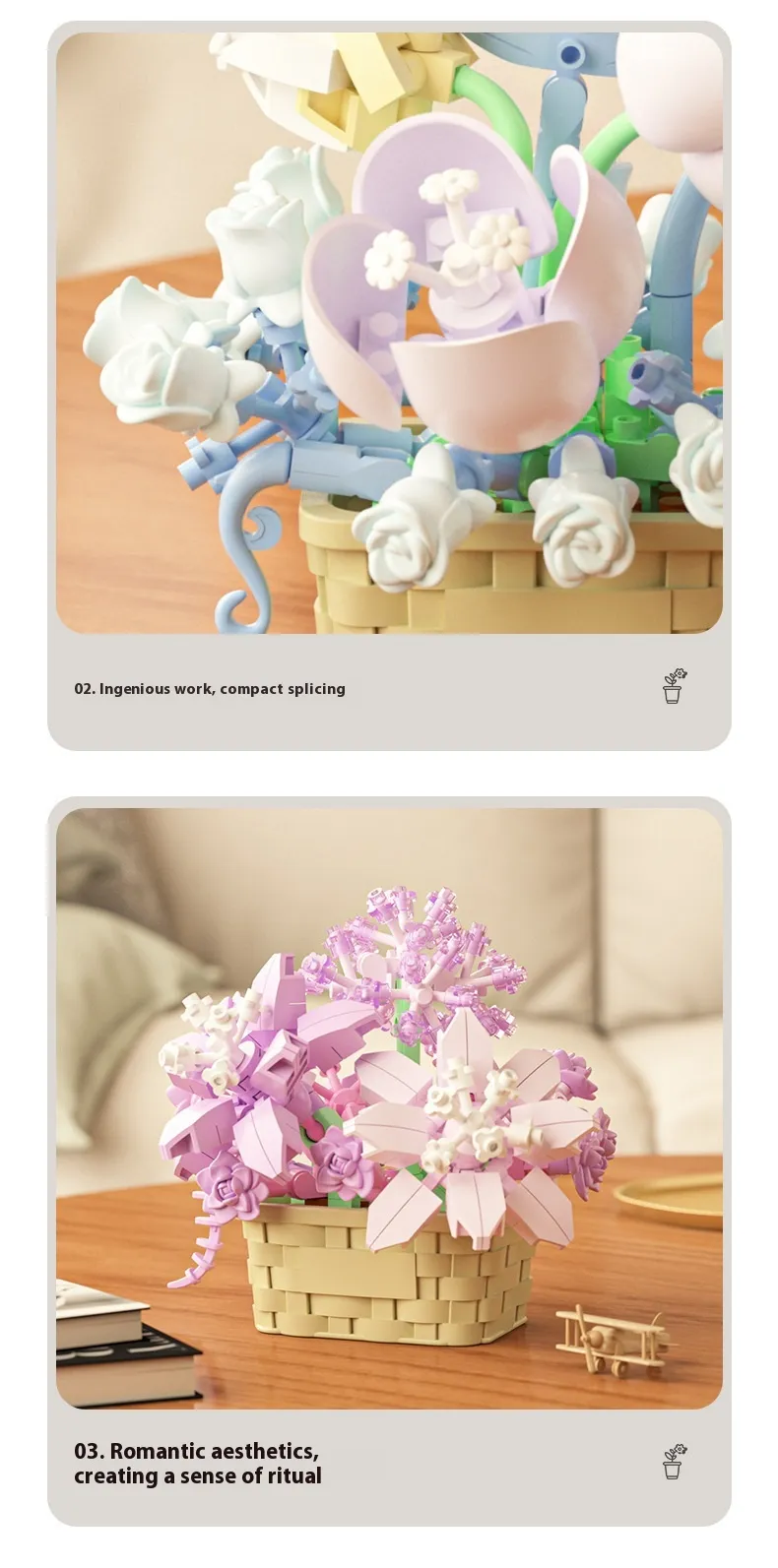 Once assembled, the flower basket serves as a lasting decoration for bedrooms, study rooms, or living areas.