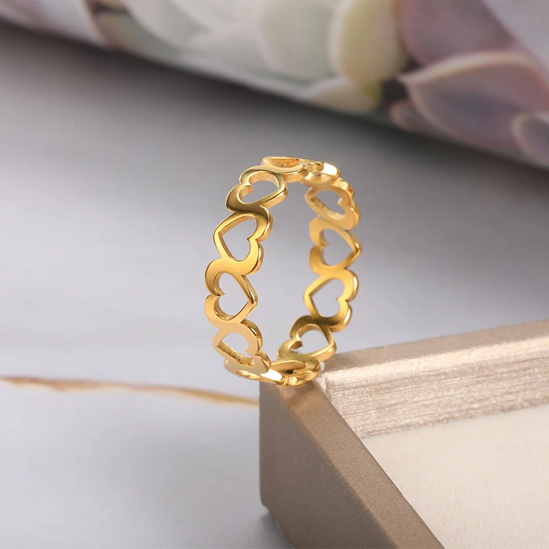 The ring features a continuous pattern of interlocking hearts, symbolizing unending love and connection. Each heart is meticulously crafted with precision, creating a delicate yet durable design that will stand the test of time. The open-heart design not only adds a touch of elegance but also ensures a lightweight and comfortable fit, making it ideal for daily wear.