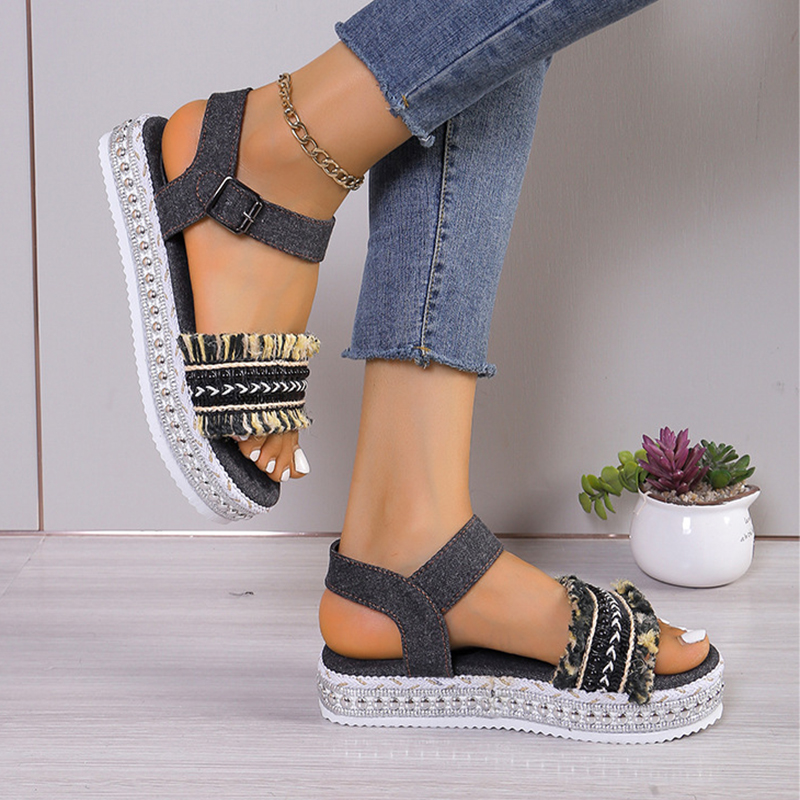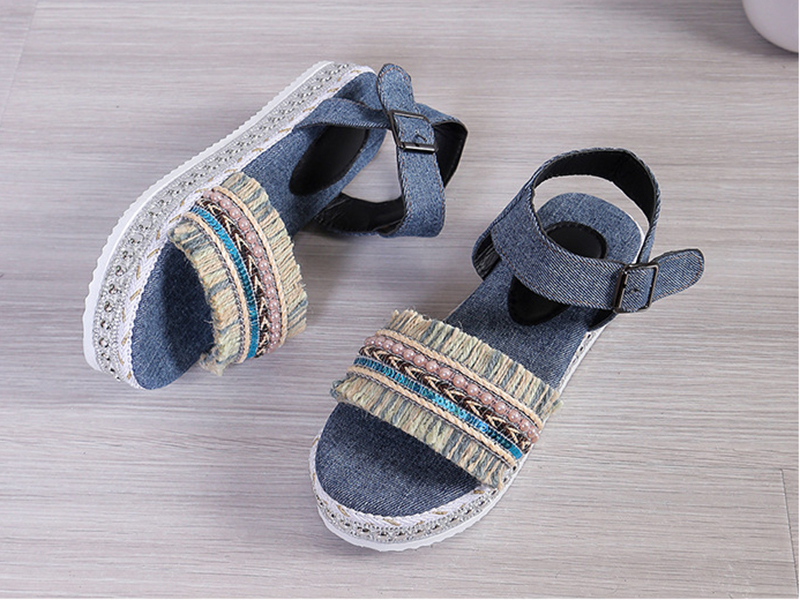Denim and Tassel Detailing These sandals showcase a stylish denim upper with playful tassel details, adding a bohemian touch to your summer wardrobe. The design is perfect for those who love to make a statement with their footwear.