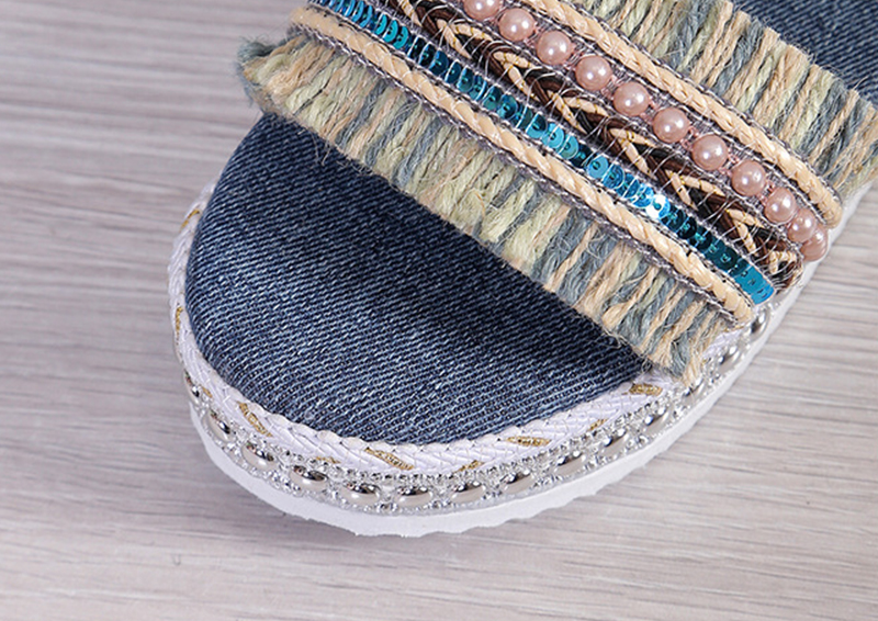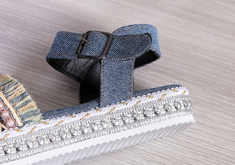 Fashion Tassel Denim Sandals With Thick-soled Flat Heel - New Summer Hemp Rope Sole Ethnic Style Shoes For Women