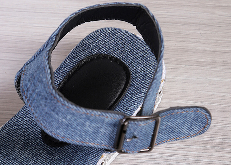 Denim and Tassel Detailing These sandals showcase a stylish denim upper with playful tassel details, adding a bohemian touch to your summer wardrobe. The design is perfect for those who love to make a statement with their footwear.