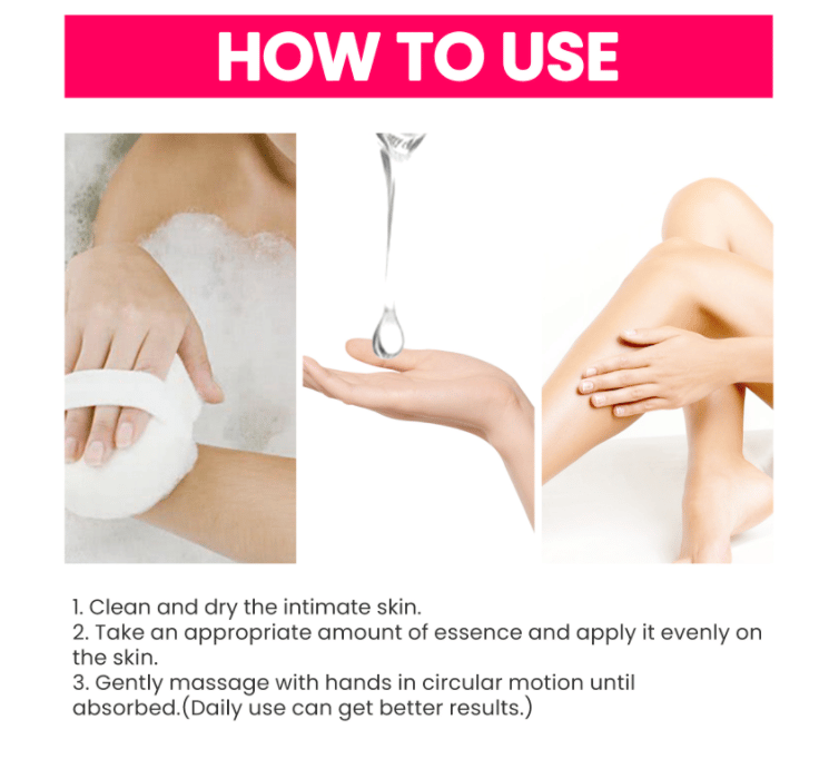 The essence is infused with moisturizing and nourishing ingredients such as aloe vera, vitamin E, and glycerin, which help keep the intimate skin hydrated and soft. These ingredients provide essential nutrients that promote healthy skin, helping to improve the texture and elasticity of the skin in the intimate region.