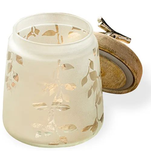 - Large frosted glass jar with an airtight wooden lid featuring a decorative metal leaf on top