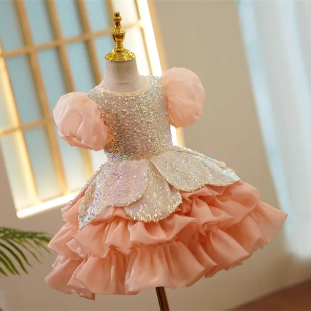 Girls Pure Color Sequins Puff Sleeve Princess Dress