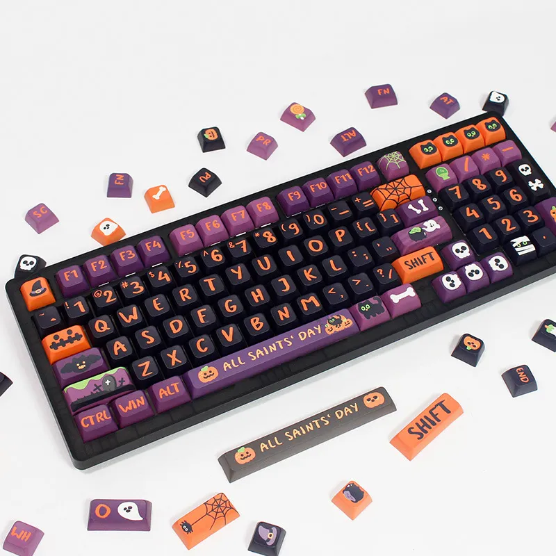- Pumpkins, ghosts, bats, and skeleton designs printed onto keycaps.