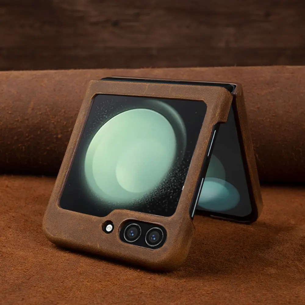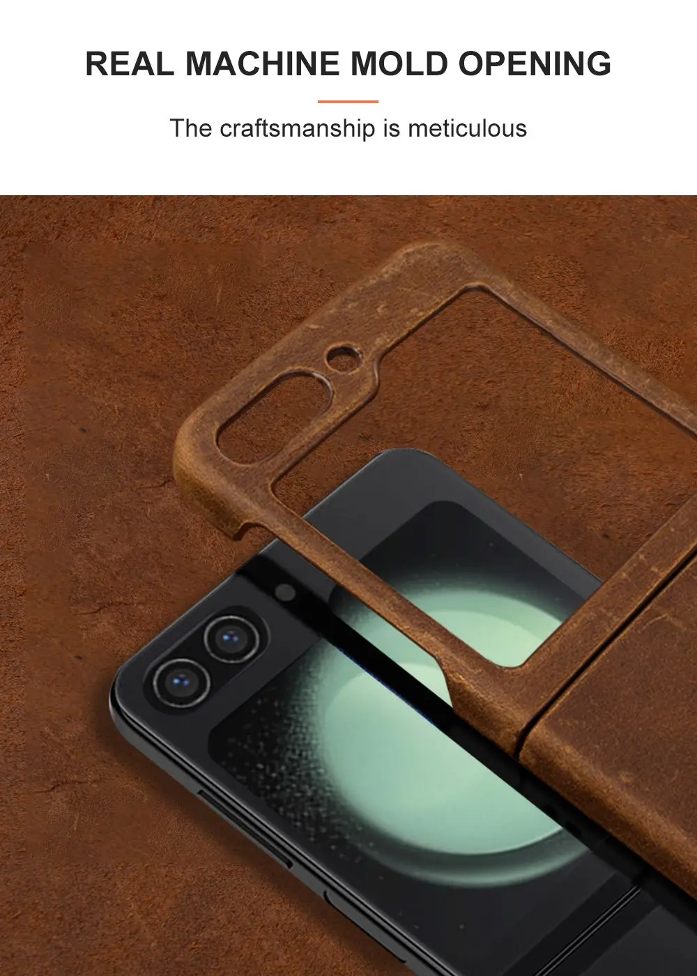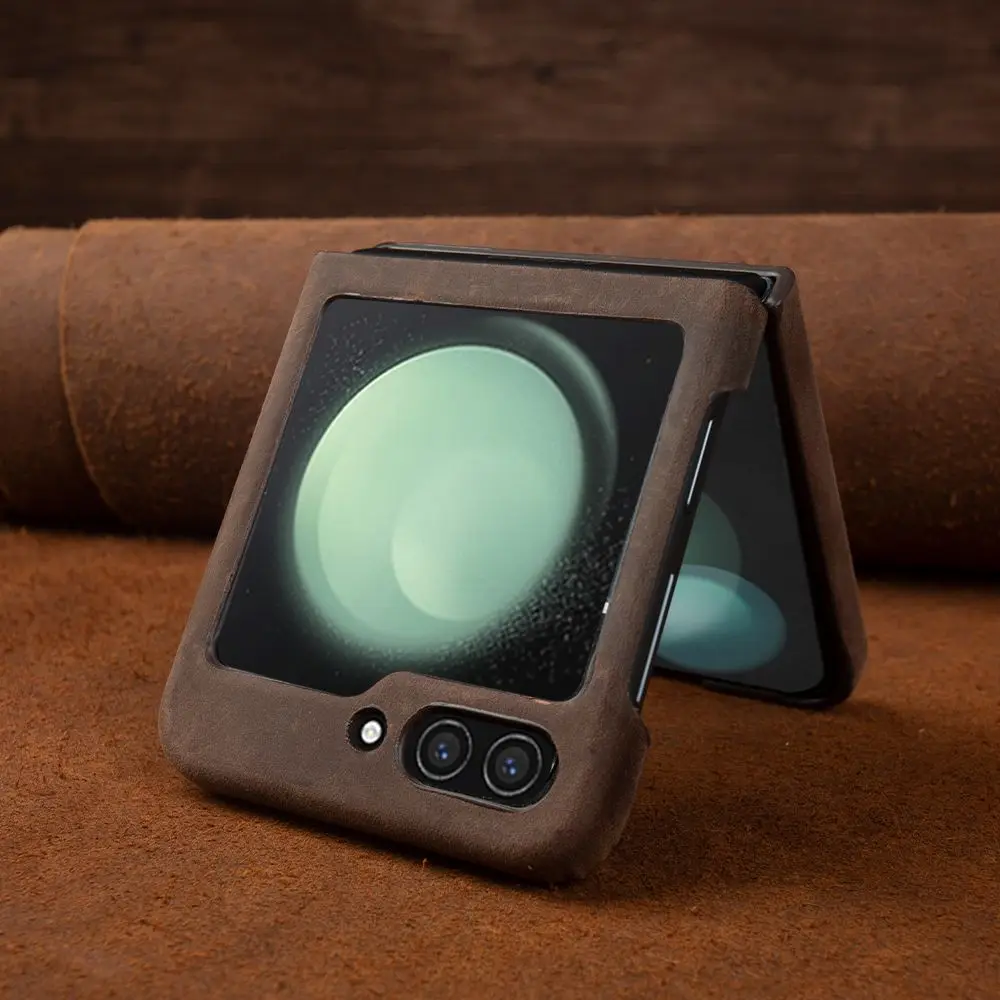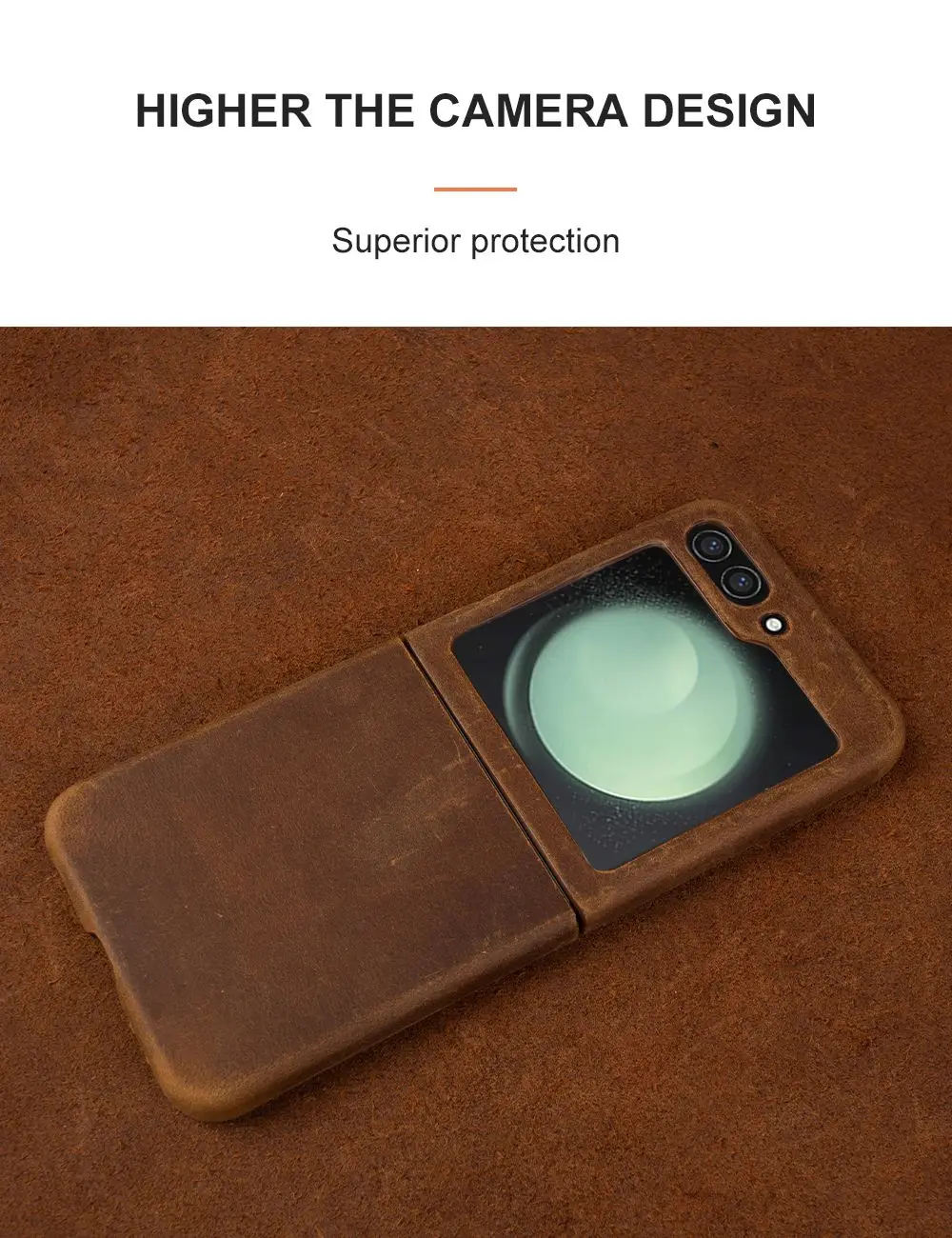 This handcrafted genuine leather case is designed for the Samsung Galaxy Z Flip3, Z Flip4, and Z Flip5. Featuring a vintage Crazy Horse pattern, this phone shell offers stylish protection and durability for your device. The back case design ensures a perfect fit and easy access to all ports and buttons.