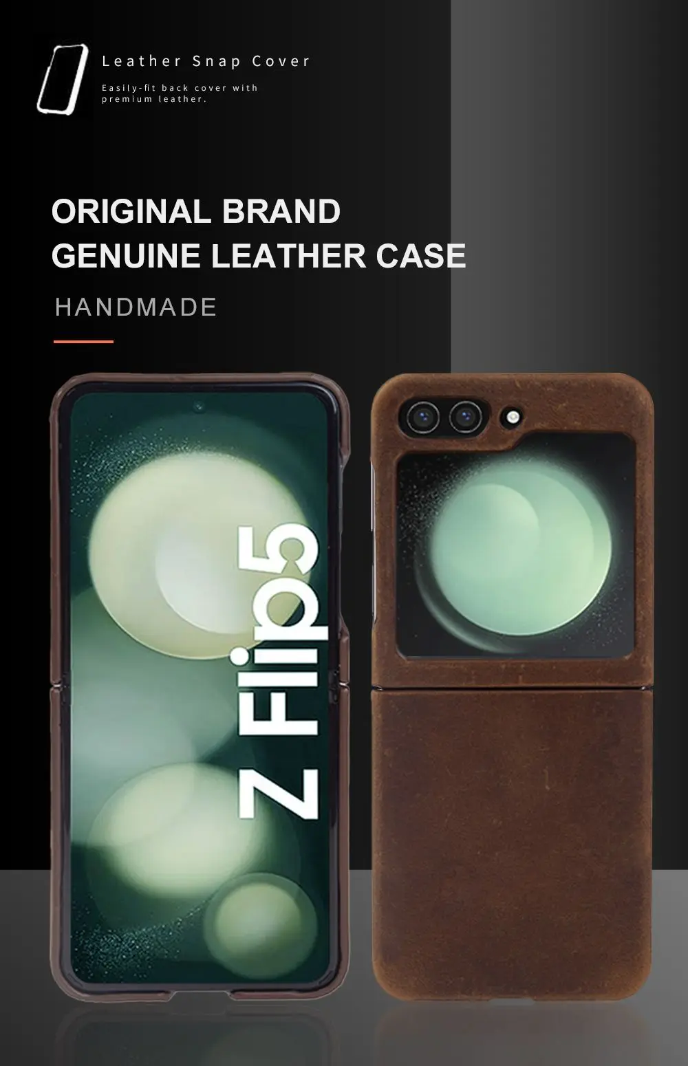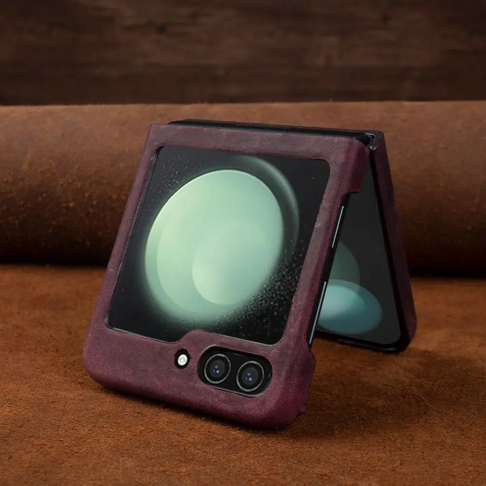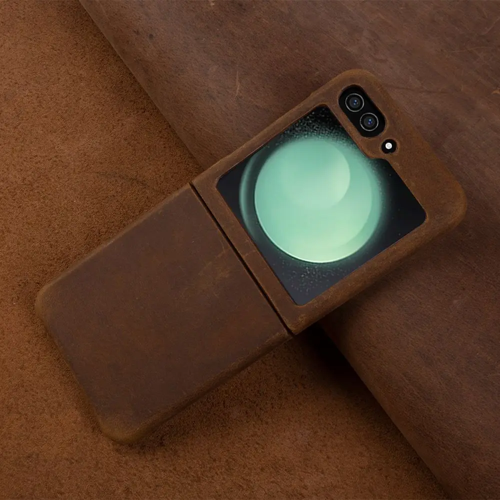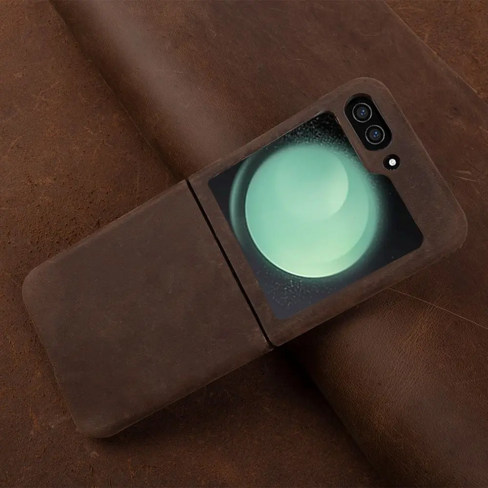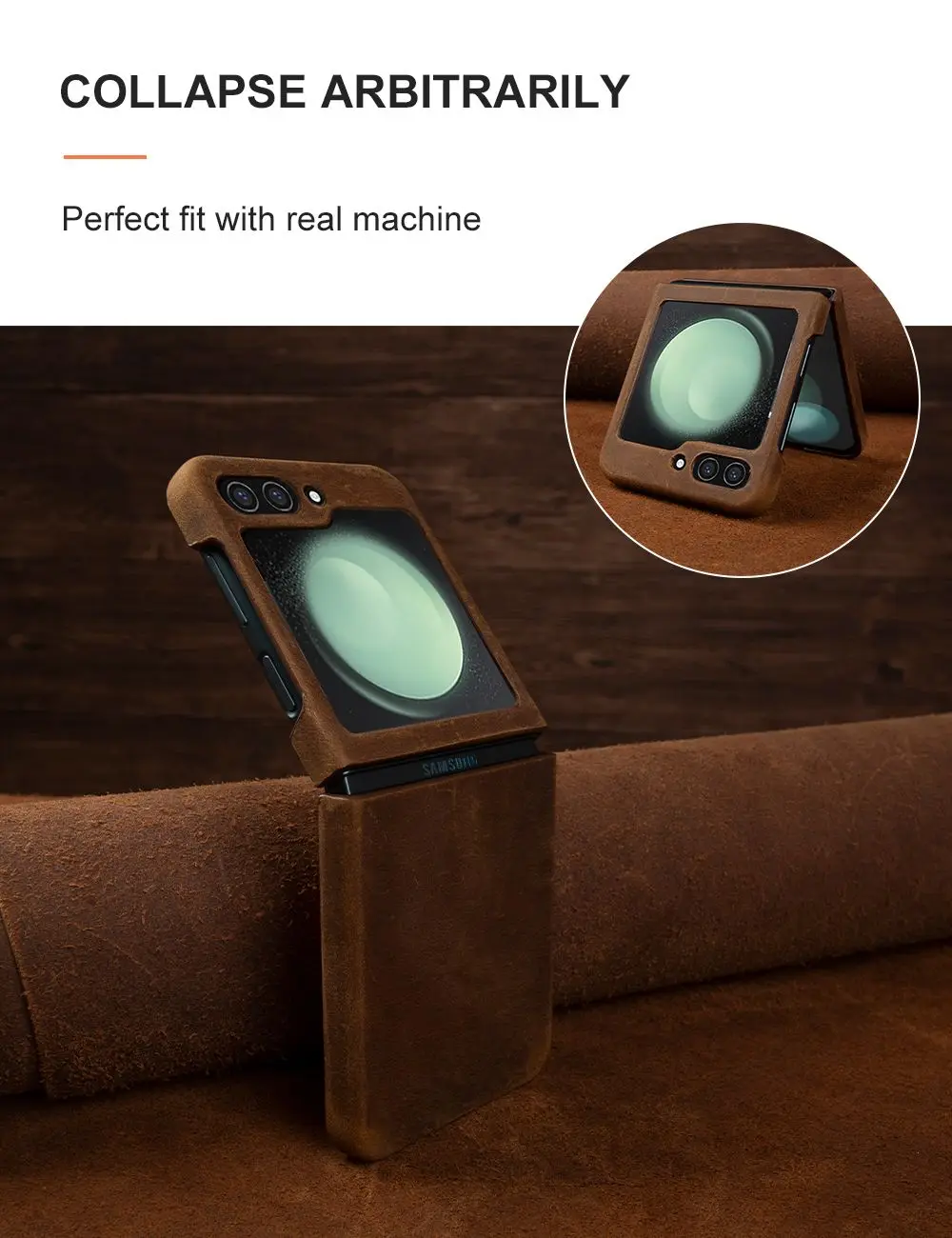 This handcrafted genuine leather case is designed for the Samsung Galaxy Z Flip3, Z Flip4, and Z Flip5. Featuring a vintage Crazy Horse pattern, this phone shell offers stylish protection and durability for your device. The back case design ensures a perfect fit and easy access to all ports and buttons.