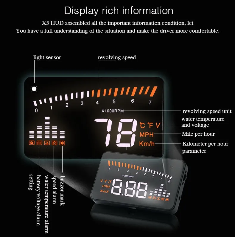 Not just for speed, this Head-up Display shows a wide range of data, including RPM, fuel efficiency, voltage, and even engine temperature. With the ability to monitor multiple parameters, this device helps ensure that your car is running smoothly and helps you detect potential issues before they become serious problems.