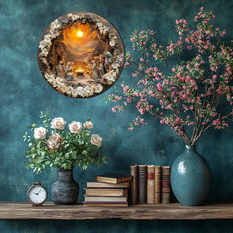 The 1pc Classic Nativity Scene Round Metal Wall Art offers a beautiful and meaningful depiction of a classic nativity scene, rendered in