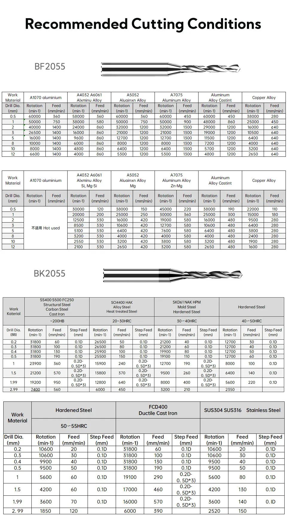 *According to the material and depth, select the grading machining method, please return to the top of the hole when grading feed. The grading amount is about 0.2 ~ 1Dc, when the diameter is less than 1mm, 0.1~0.2Dc.
