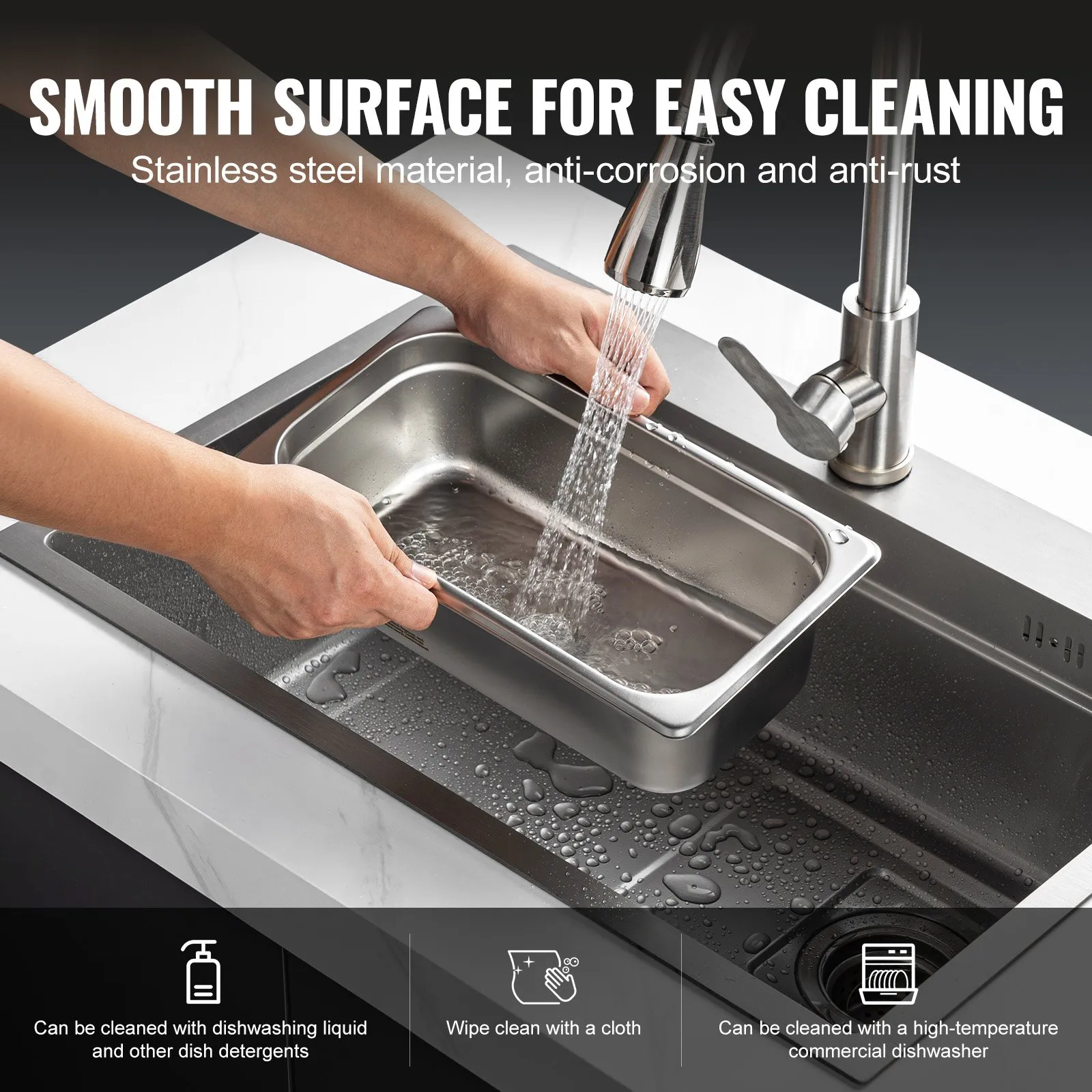 Standard Sizes: Full (1/1), Half (1/2), Third (1/3), Quarter (1/4), Sixth (1/6), and Ninth (1/9) pans to fit perfectly in