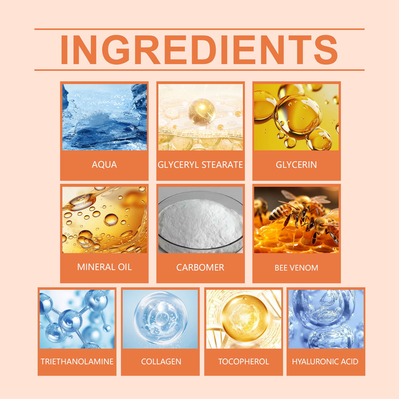 Ingredients: Water, glycerin, mineral oil, glycerin stearate, carbomer, triethanolamine, bee venom, Collagen, hyaluronic acid, Vitamin