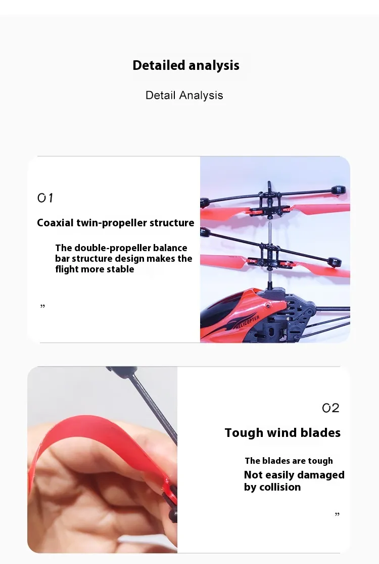 Crafted with lightweight yet durable materials, the helicopter is built to withstand bumps and falls, ensuring long-lasting play. Its LED lights add extra excitement, especially when flying indoors at night. With automatic altitude hold and easy start/stop functions, even younger children can enjoy safe and thrilling flying experiences.