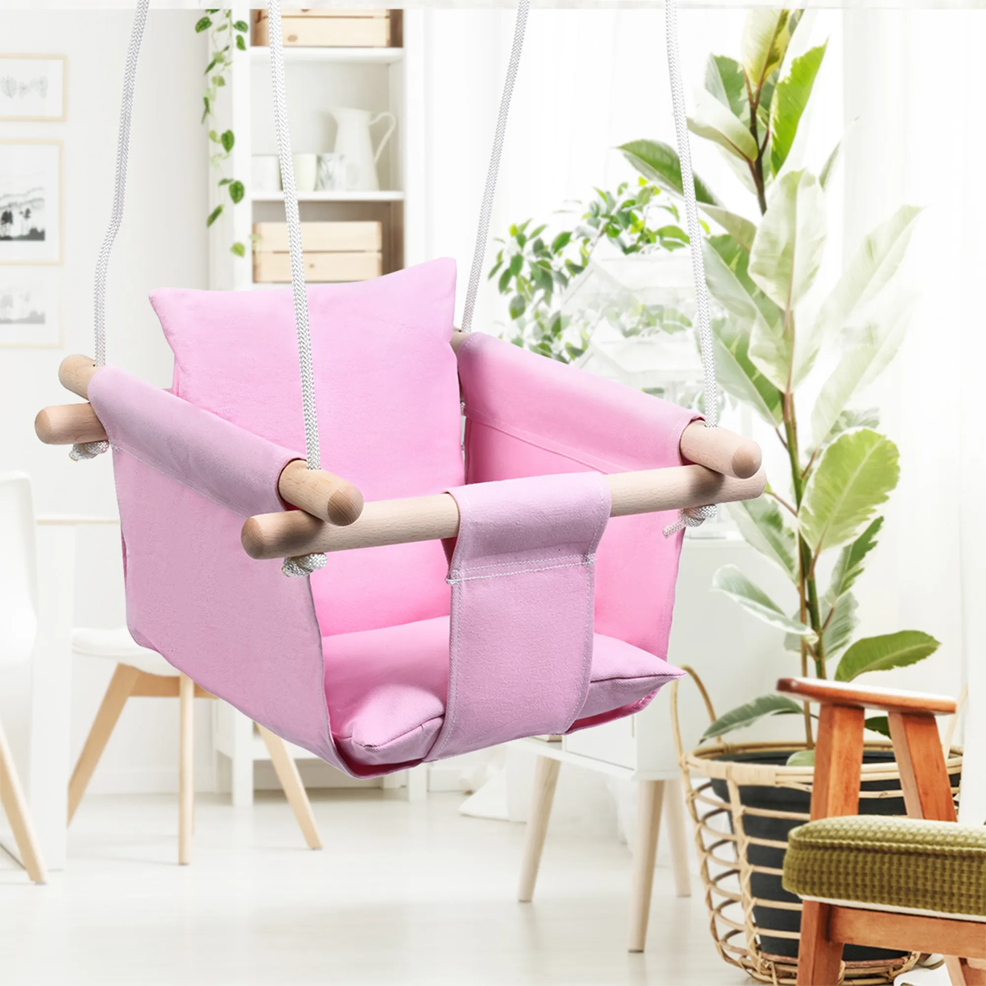Smooth and sturdy beech wood has no edges and corners that will not damage your baby's skin. This canvas hanging swing seat can be used both
