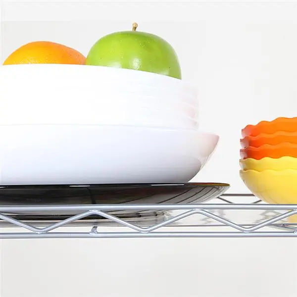 Solid carbon steel structure, bright silver varnishing, this storage rack features stylish look and strong anti-rust performance. Mesh