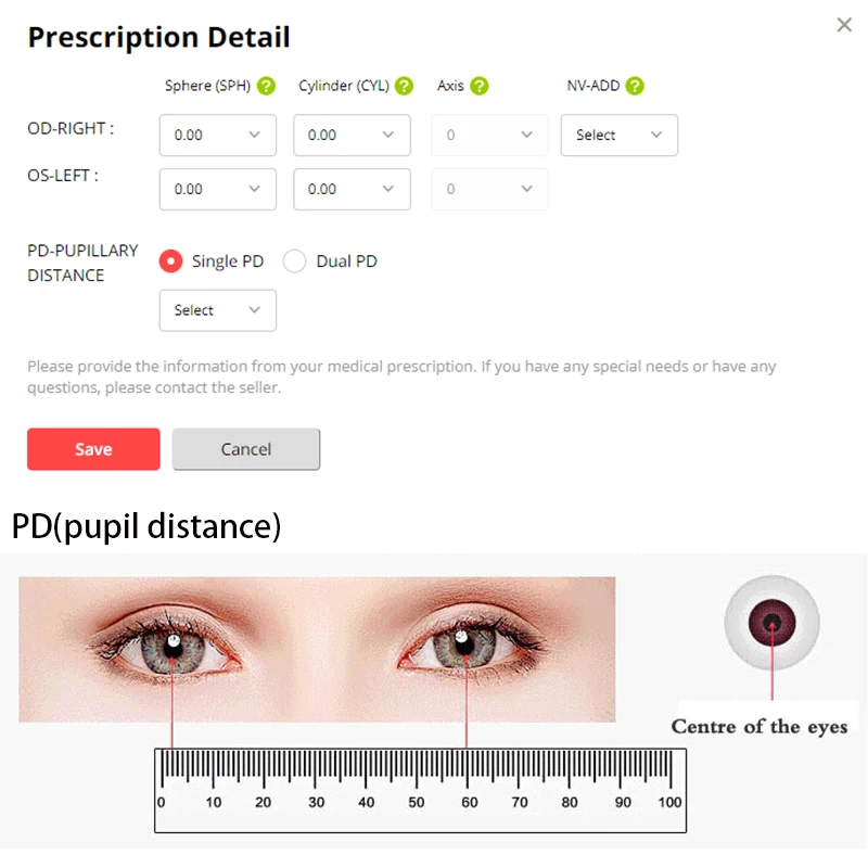 1.Diopter(S), 2. Pupil distance(PD), 3.Cylinder(C),4.Astigmatism(A),5.Add