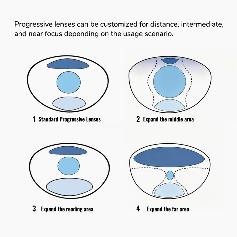 1. Standard progressive lenses ,the design seeks a balance between long, medium and short distances. Suitable for beginners.