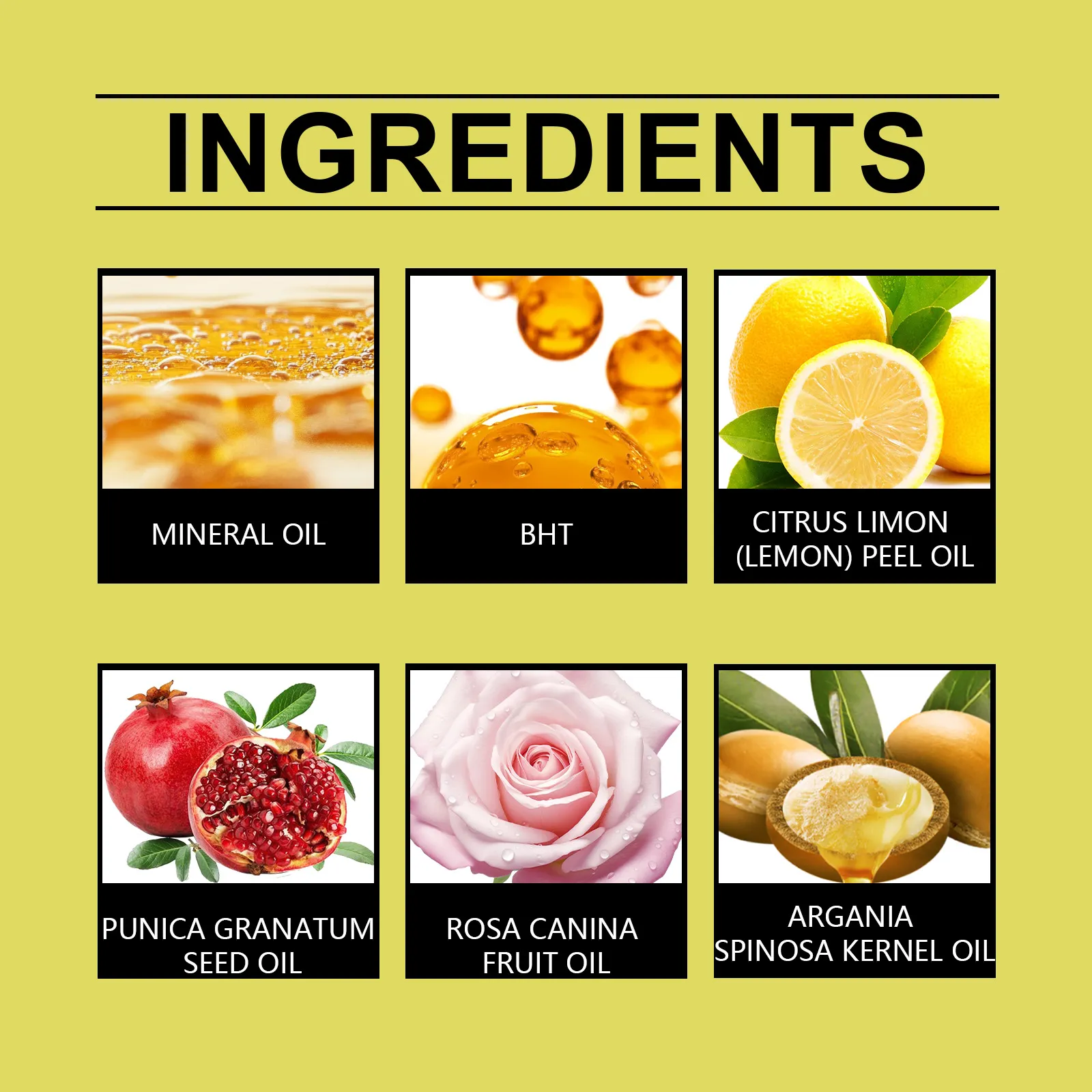 Product Ingredients: mineral oil, butylene, lemon fruit peel oil, pomegranate seed oil, rosehip oil, Morocco nuts oil