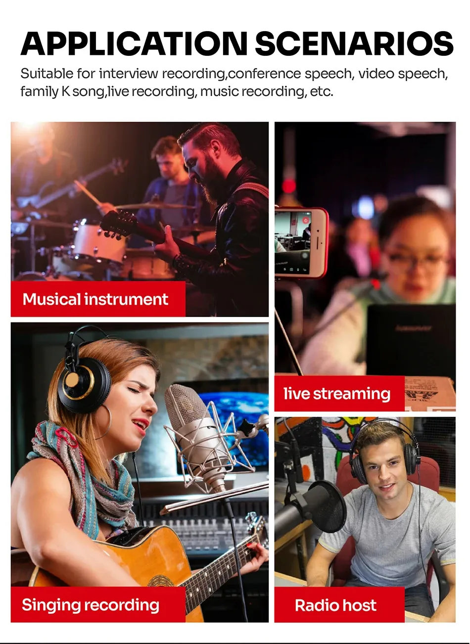 Designed for versatility, this microphone works seamlessly with both mobile phones and computers. You can connect it to your smartphone for live performances or podcasts on-the-go or use it with your computer for recording and streaming. The easy plug-and-play functionality ensures no hassle during setup, making it a great choice for users of all experience levels.