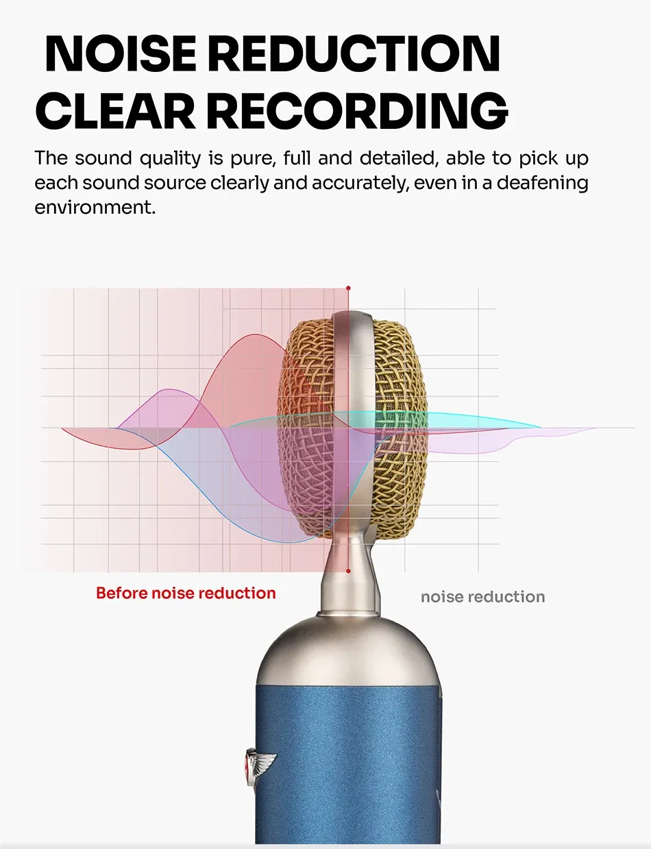 For the best sound clarity, the microphone features noise-canceling technology, which minimizes background noise. This is particularly useful in noisy environments, ensuring that your voice stands out even when you're recording or performing in less-than-ideal conditions.