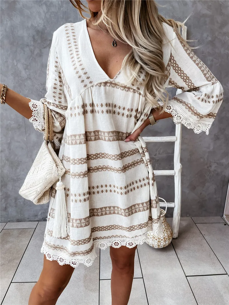 Long Sleeve Geometric Print Dress Fashion Loose Stitching V-neck Lace Cuff Dresses Womens Clothing
