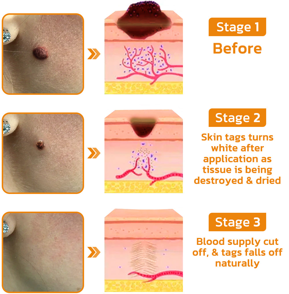Skin tags, also known as acrochordons, are small, soft, benign growths that protrude from the skin. They typically appear as tiny, flesh-colored or slightly darker skin flaps, often attached to the skin by a thin stalk or peduncle. Skin tags are common, factors such as friction, hormonal changes, genetics, obesity, and insulin resistance may contribute to their formation.