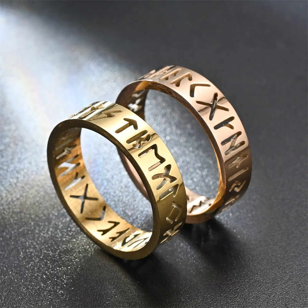 Main Stone Color: GOLD, Ring Size: 4.25 - 2023 New Stainless Steel Hollow Out Ring for Men Women Fashion Hollow Rune Design Finger Anillo Antiestres Anxiety Rings