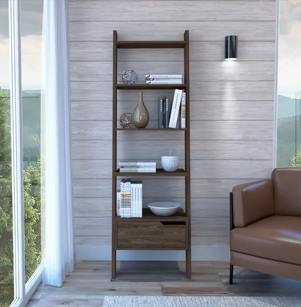 Oslo trapezoidal bookshelf, four legs, one drawer, five open shelves - deep walnut wood