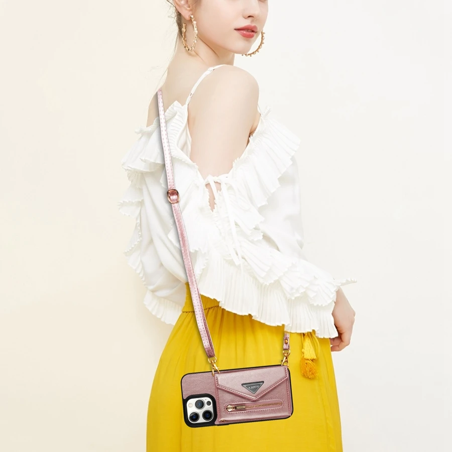 Material: ABS, Color: Pink - Wallet Side Card Zipper Flip Crossbody Leather Case For iPhone 15 14 Pro Max 13 Mini 12 11 SE 2022 2020 X XS XR 8 7 6 6s Plus