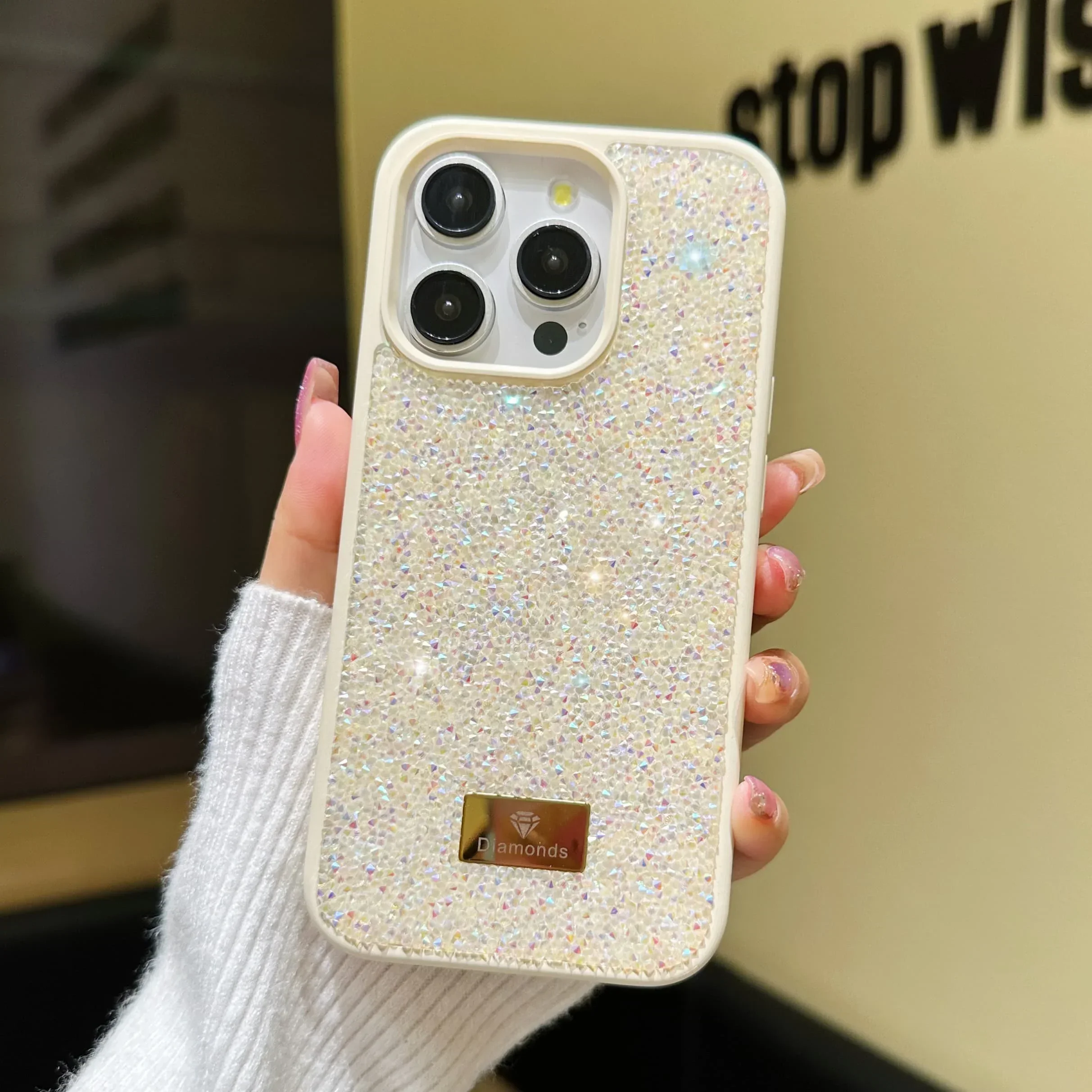 Material: Cotton Fabric, Color: Beige - Luxury INS Dazzling Full Covered Zircon Macaroon Color Phone Case for iPhone 16 15 14 11 12 13 Pro Max Plus Back Cover
