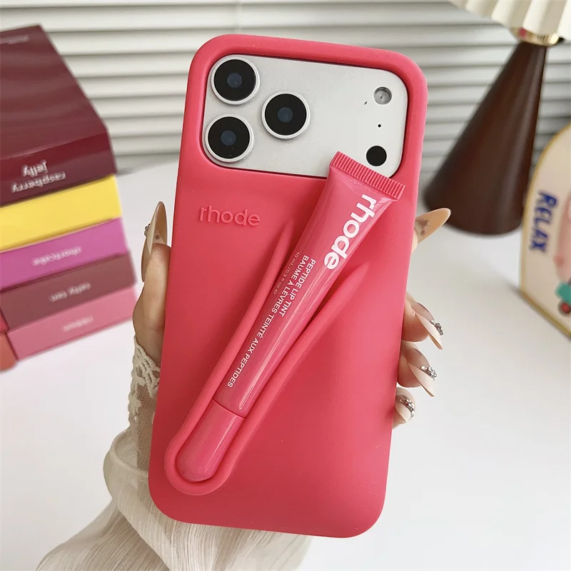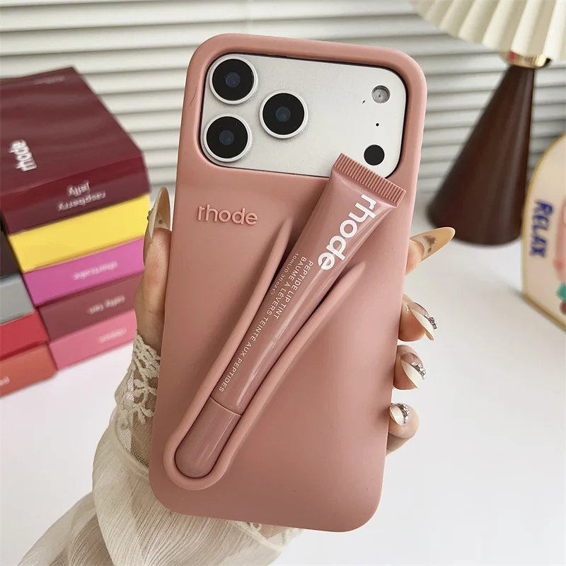 Material: Denim, Color: Beige, Bundle: Bundle1 - With Lipstick Phone Case for iPhone 17 13 14 15 16 17 Pro Max Plus 12 17 Air Silicone Lip Gloss Holder Hot INS Soft Cover Funda