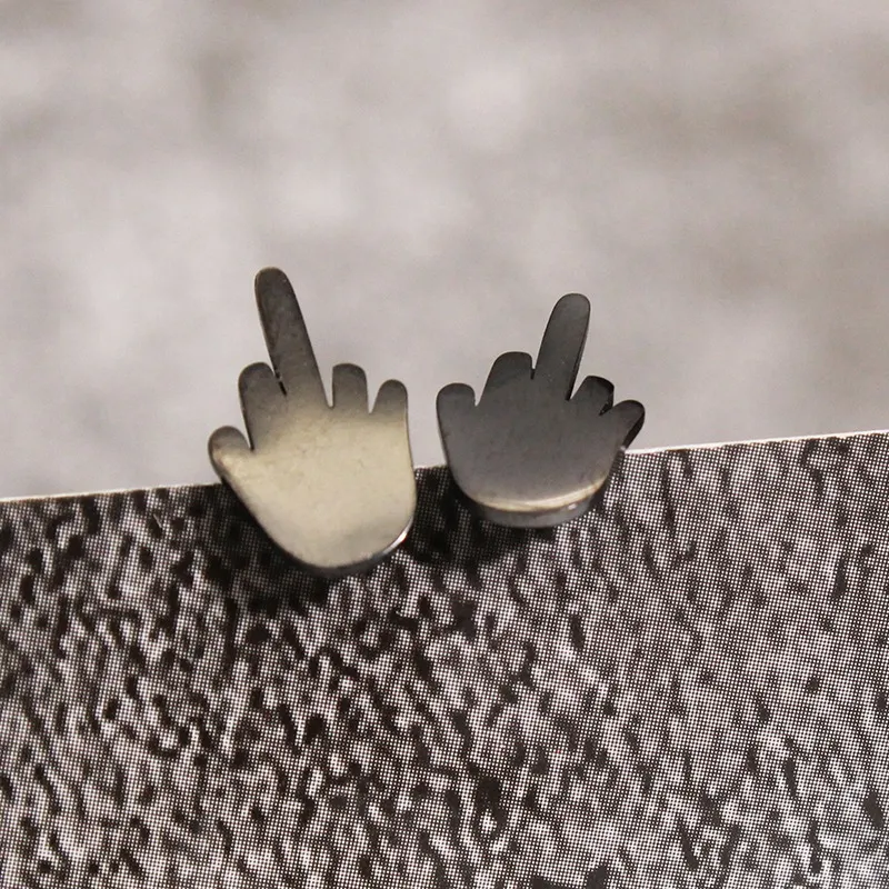 - Design: Middle finger gesture earrings with intricate details and polished finishes