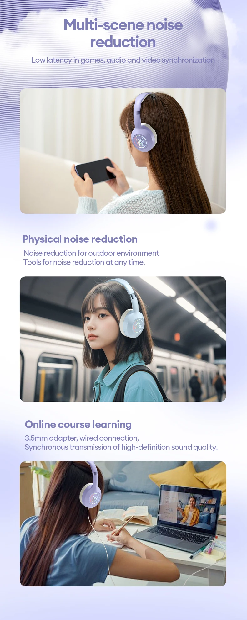 The Miniso Sanrio EM-368 Bluetooth 5.2 Headphones offer a unique blend of high-quality audio performance and whimsical design. Perfect for fans of Sanrio characters, these wireless earphones come with exciting RGB light effects and feature designs inspired by Kuromi, Melody, and Hello Kitty. The combination of superior sound quality and playful aesthetics makes these headphones a perfect accessory for both everyday use and special occasions.