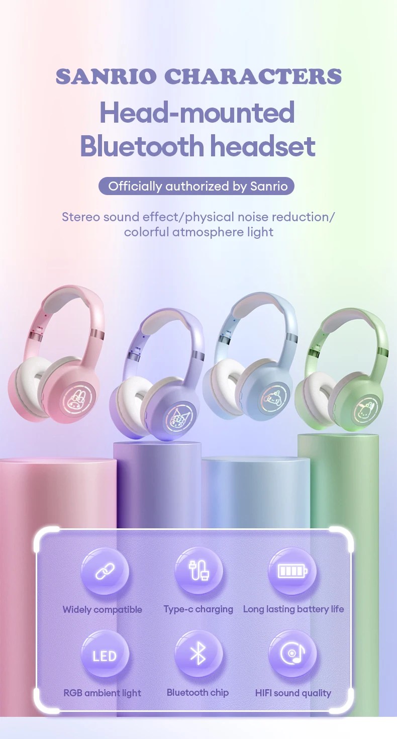 Miniso Sanrio EM-368 Bluetooth 5.2 Headphones – Stereo Sound Wireless Earphones with RGB Light, Kuromi, Melody, and Hello Kitty Designs