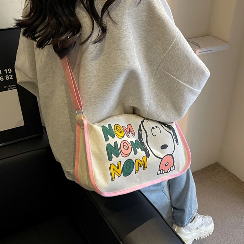 MINISO Snoopy Cartoon Cute Print Canvas Bag – Large Capacity One Shoulder Dumpling Bag, Women's Crossbody Bag